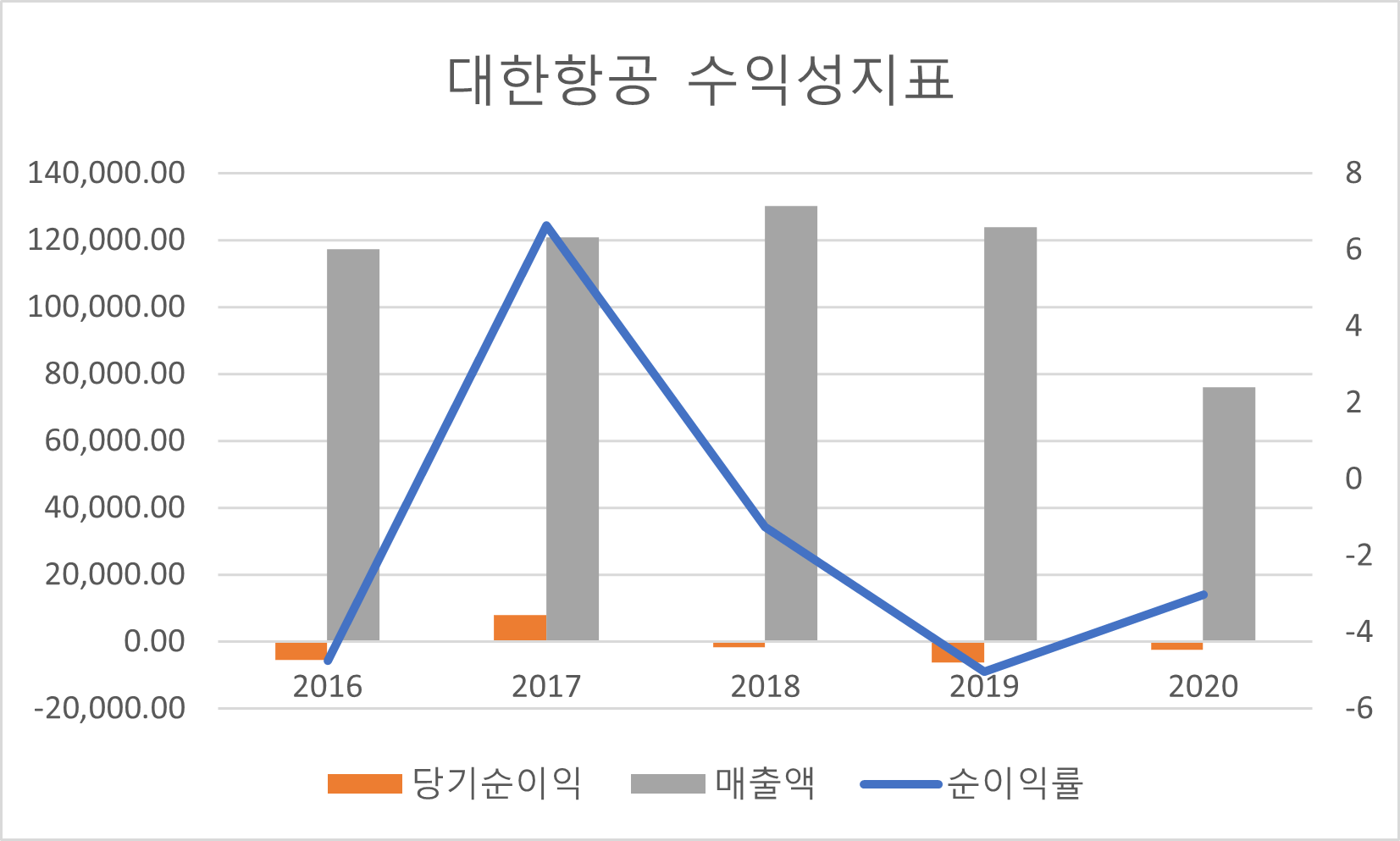 - 대한항공의 매출액은 2020년에 급감한 것을 볼 수 있습니다.